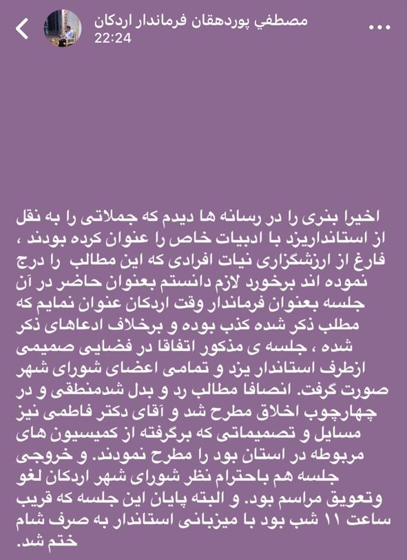 توضیح فرماندار سابق اردکان از نشست استاندار یزد با اعضای شورای شهر اردکان و فضای صمیمی حاکم بر جلسه، گواه روشنی بر کذب بودن چنین مطالبی است و عملا خط پایان و بطلانی بر این ادعاهای کذب است.