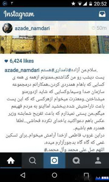 گفتنی است با وجود حذف این عکس و توضیح از صفحهی اینستگرام آزاده نامداری، خبر آن در شماری از وبسایتهای خبری داخل ایران انتشار یافته است.