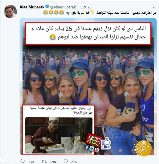 به گزارش فرارو، حضور پررنگ زنان و دختران لبنان در تظاهرات فعلی این کشور، توجه بسیاری از ناظران مسائل سیاسی و اجتماعی و نیز کاربران شبکههای اجتماعی را جلب کرد. علاء مبارک، پسر ارشد حسنی مبارک، یکی از این کاربران است که در توئیتی ظنزآمیز، توجه کاربران را به مشارکت سیاسی زنان لبنان جلب کرد.