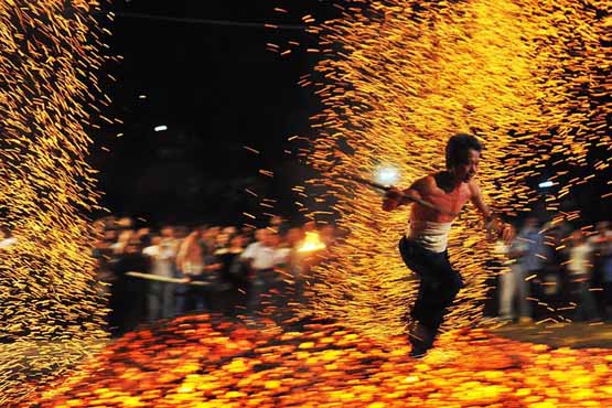 عکس:گام برداشتن یک مرد چینی بر روی آتش در مراسمی در چین