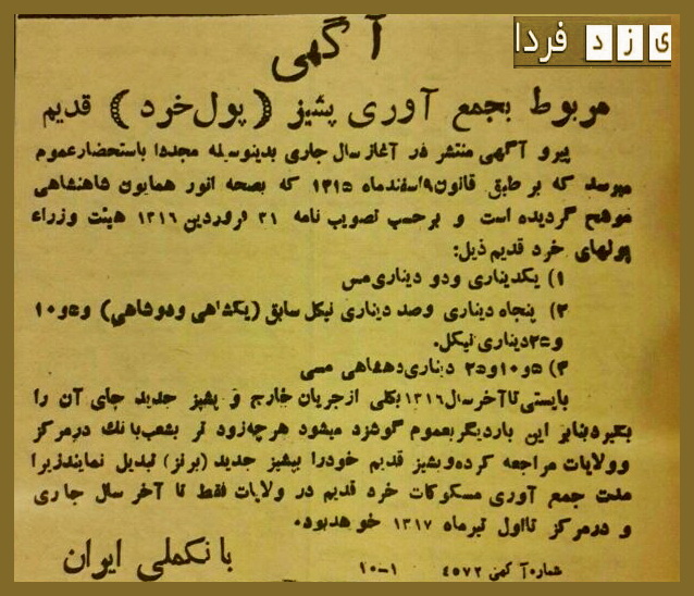 این آگهی تاکید دارد که پشیز قدیم با پشیز جدید که جنس برنز دارد جایگزین خواهد شد و پول خرد قدیمی تا تیرماه سال ۱۳۱۷ اعتبار دارد .