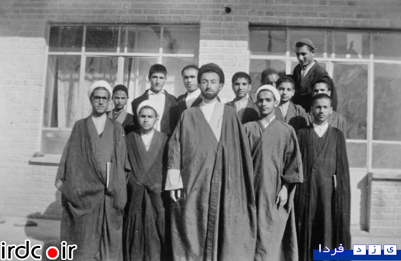 آیت الله محمد بهشتی ( در سنین جوانی ) و حسن روحانی در میان عده ای از طلاب