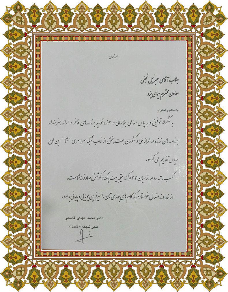 به گزارش  خبری یزدفردا " دکتر محمد مهدی قاسمی مدیریت شبکه "شما"با ارسال لوح تقدیر از معاونت وهمکاران پرتلاش سیمای یزد بخاطر تولید برنامه های زنده  وارائه هنرمندانه  آن در شبکه ملی "شما" تقدیر وتشکر کرد .