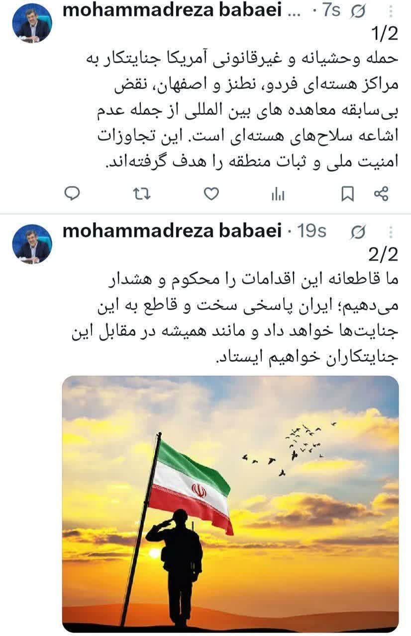 به گزارش یزدفردا: محمدرضا بابایی در واکنش به حمله وحشیانه و غیرقانونی آمریکا به تاسیسات هستهای کشور در بامداد امروز (یکشنبه، یکم تیر) در صفحه شخصی خود در فضای مجازی نوشت: حمله وحشیانه و غیرقانونی آمریکا جنایتکار به مراکز هستهای فردو، نطنز و اصفهان، نقض بیسابقه معاهده های بین المللی از جمله عدم اشاعه سلاحهای هستهای است.