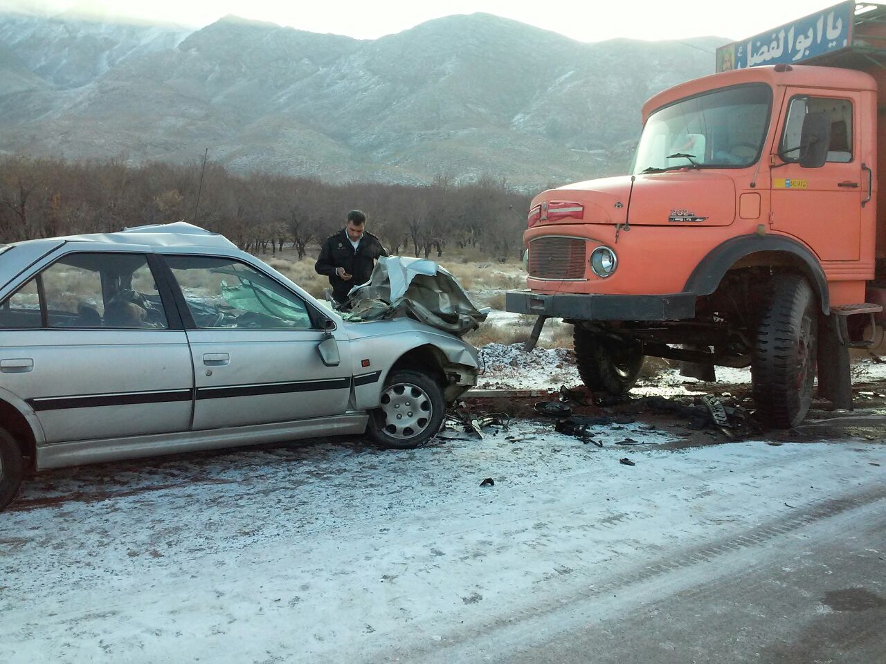 این حادثه به علت یخ زدگی و لغزندگی جاده و سرعت زیاد خودرو که باعث انحراف آن به چپ و برخورد با کامیون شده است .