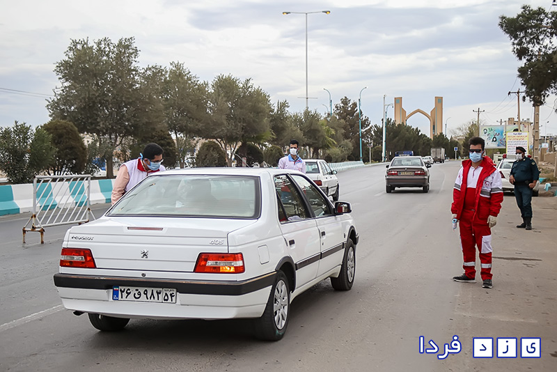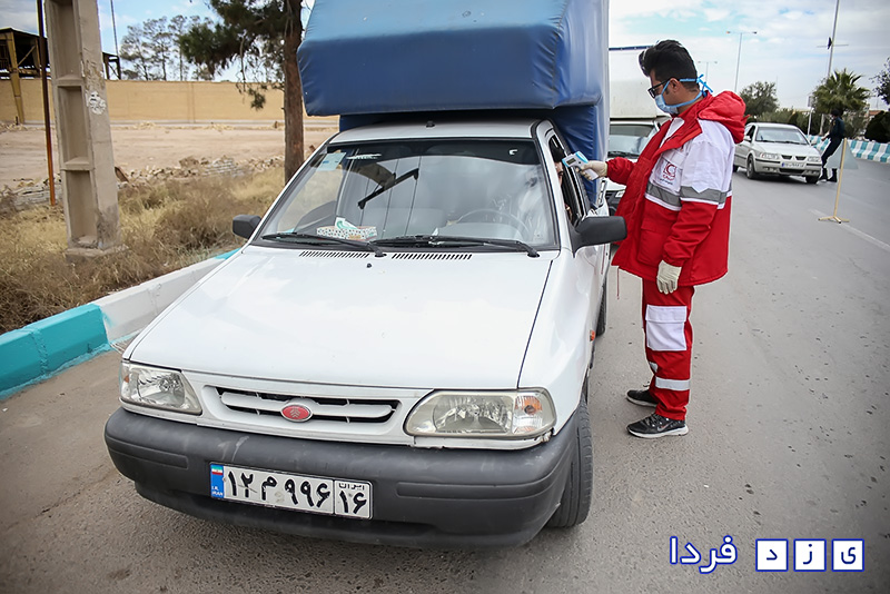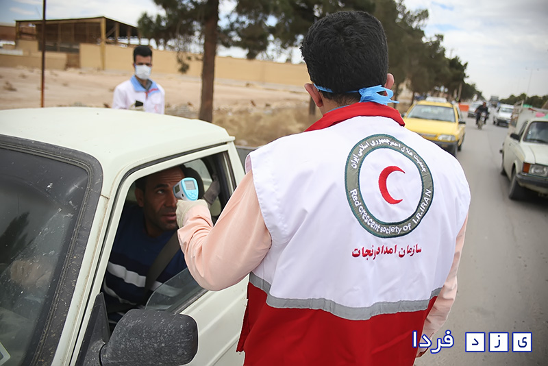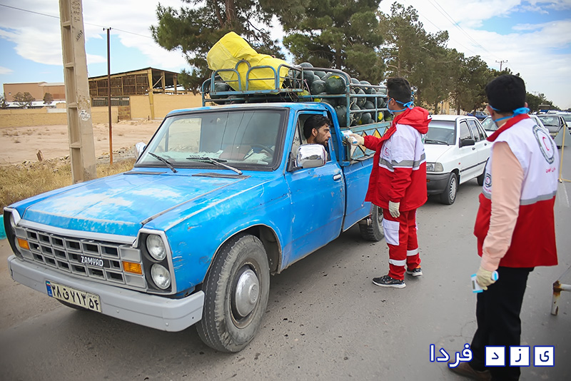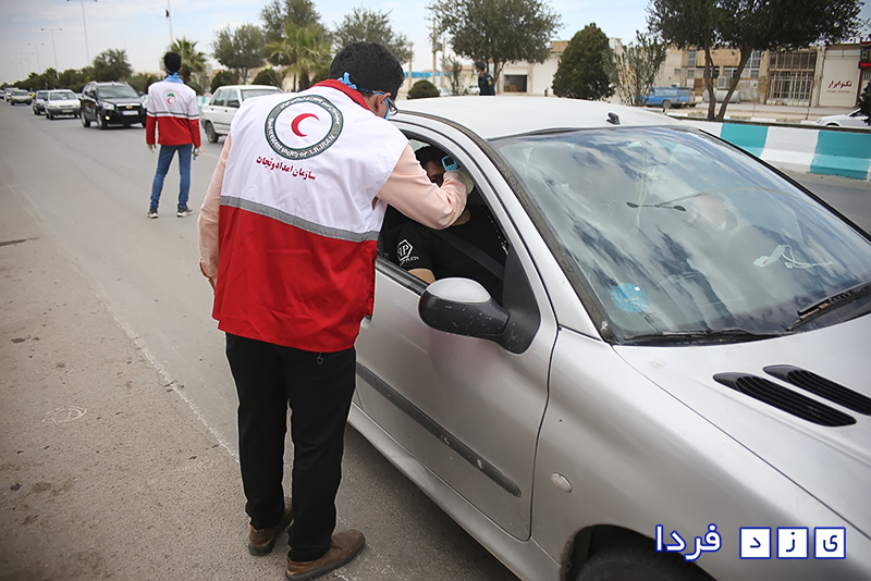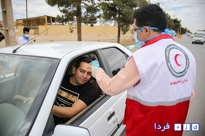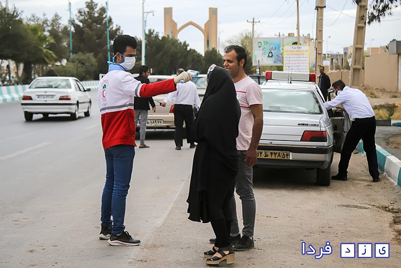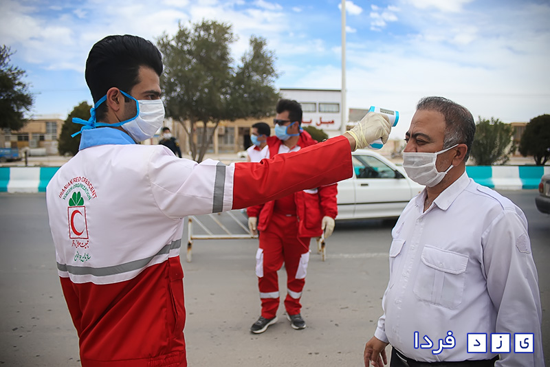 ایستگاه غربالگری تب سنجی هلال احمر با همکاری نیروهای بسیج و انتظامی به منظور جلوگیری از شیوع ویروس کرونا در دروازه قرآن یزد
