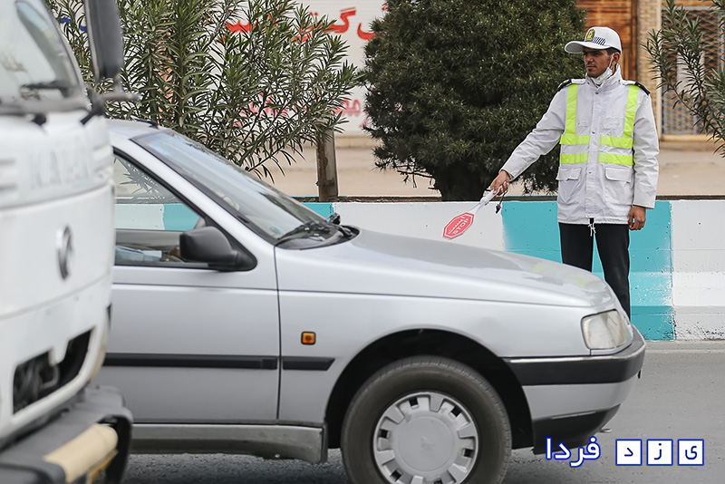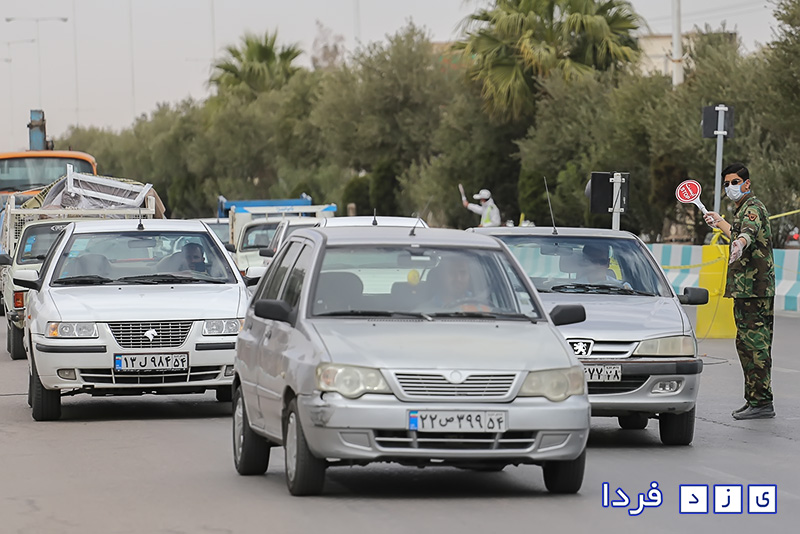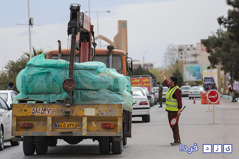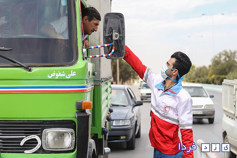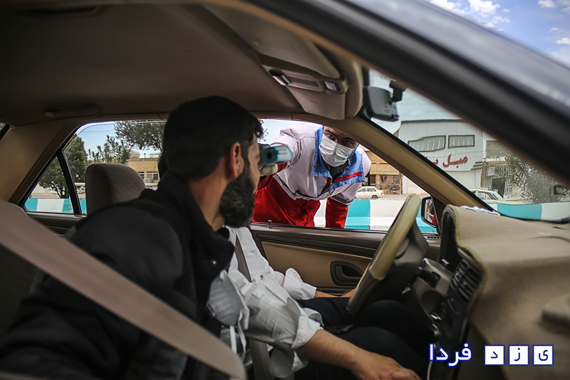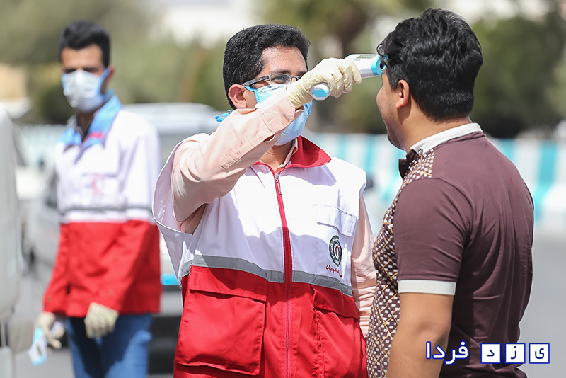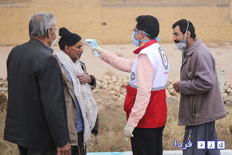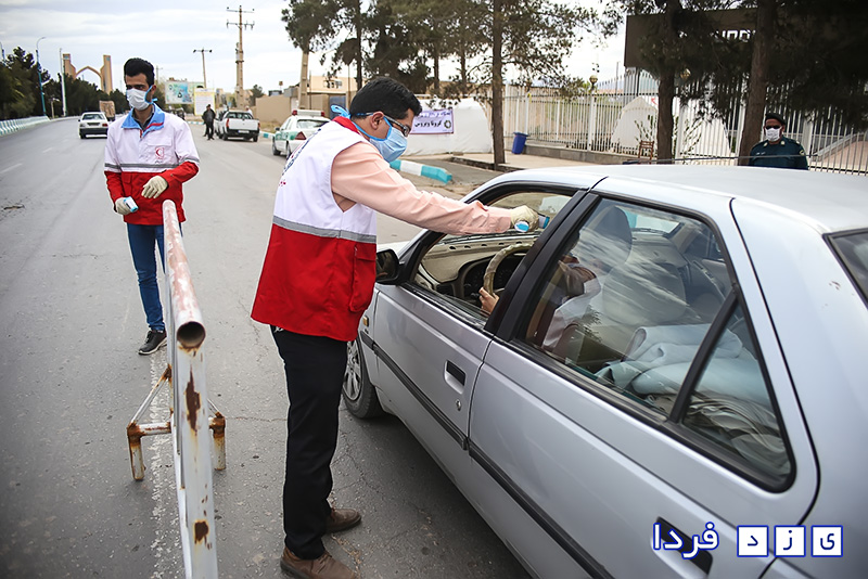 ایستگاه غربالگری تب سنجی هلال احمر با همکاری نیروهای بسیج و انتظامی به منظور جلوگیری از شیوع ویروس کرونا در دروازه قرآن یزد